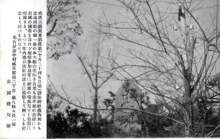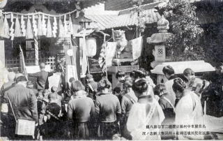 | ・「日置通」二丁目第八組 赤誠健児団」 塩竈神社(現:中川区)参拝風景が4枚の組絵葉書になっている。 日参に向かう風景、神社で子どもの代表が祝詞を奏上している風景、宮城(皇居)遙拝などを済ませて境内から出てくる風景、境内の忠魂碑前の桜六輪が10月に花開いた風景である。男の子は坊主刈り、女の子はおかっぱ頭、付添の女性が掛けるタスキには「大日本国防婦人会」の文字があり、昭和13年の風景だ。この年の5月には国家総動員法が施行されている。 |