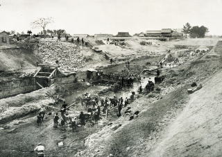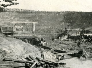 | ◇人造石伏越への改築風景 (『庄内用水元樋及矢田川伏越碑改築紀念』より) |