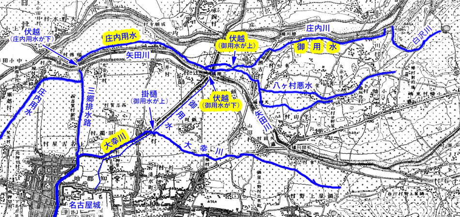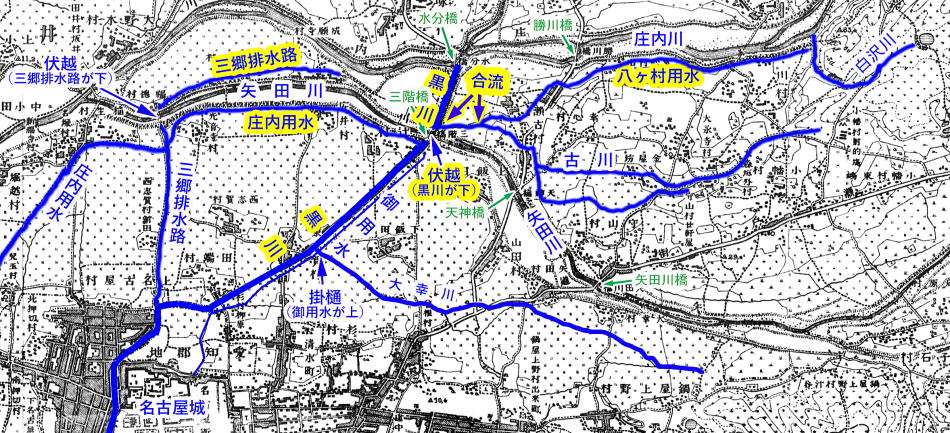 | 黒川開削事業の中で関連する河川や水路の付け替えが行われ名古屋北部の水系は大きく姿を変えた。 ◇御用水 黒川開削以前は龍泉寺の麓で庄内川から取水して名古屋城まで水を送っていた。黒川の開削により、守山区内の旧御用水路は取水位置を少し変えて八ヶ村用水となり、余り水は古川を経由して黒川に流入するようになった。 姿を変えた新御用水は、矢田川伏越の出口で黒川から分流してお城へ流れるようになった。 ◇旧八ヶ村悪水(古川) 黒川開削以前は三階橋北で御用水を伏せ越し、すぐ下流で旧庄内用水へ流入していたが、黒川の開削により黒川へ流入する川になった。名称はその後古川と呼ばれるようになっている。なお、現在は守西ポンプ所で矢田川に排水している。 ◇庄内用水 黒川開削以前は三階橋の北で御用水から分流し、川中三郷(成願寺・中切・福徳村)を流下して、福徳村で矢田川を伏せ越して稲生村へ出て西へと流れる川であった。 黒川の開削により、矢田川伏越の出口で黒川から分流し、新たに当時の矢田川堤防に沿って開削された水路で西へ流れ、稲生村で旧水路へ流入するように変わった。 ◇大幸川 黒川開削以前は大幸村(現:東区大幸町など)付近から流れ出し、御深井の庭の北と西を流下して朝日橋で堀川ヘ流入していた。 黒川の開削により、現在の猿投橋より下流は黒川になり、それより上流の大幸川は黒川の支流となった。 |