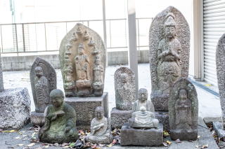 霊光院には延命地蔵が祀られている。あちこちにある長寿を願う延命地蔵ではない。昭和20年3月の空襲の時、三階橋付近で避難民の上に爆弾が落とされて250名余りが亡くなった。その犠牲者を弔う地蔵である。その他に、飯田学区から出征して戦死した方、戦災で亡くなった方の慰霊碑や、日露戦争・太平洋戦争で戦死した方の個人慰霊碑、庚申塔や役行者像などもあり、地域が歩んできた歴史が残されている寺である。 |