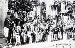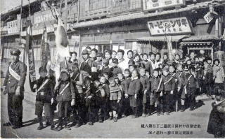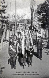 | ・「日置通」二丁目第八組 赤誠健児団」 塩竈神社(現:中川区)参拝風景が4枚の組絵葉書になっている。 日参に向かう風景、神社で子どもの代表が祝詞を奏上している風景、宮城(皇居)遙拝などを済ませて境内から出てくる風景、境内の忠魂碑前の桜六輪が10月に花開いた風景である。男の子は坊主刈り、女の子はおかっぱ頭、付添の女性が掛けるタスキには「大日本国防婦人会」の文字があり、昭和13年の風景だ。この年の5月には国家総動員法が施行されている。 |