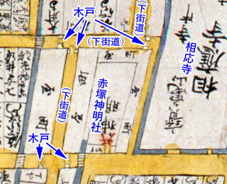 江戸時代名古屋の町の入口には大木戸が設けられていた。下街道からの入口 赤塚にも大木戸があり、夜になると閉鎖され、城下へ不審者が入り込まないようにしていた。また、街中にも各所に木戸があり、町の治安を維持していた。 |