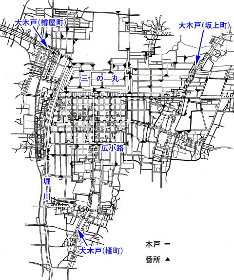 ![]() 木戸・番所の配置 宝暦12年(1762) 『新修名古屋市史』 |